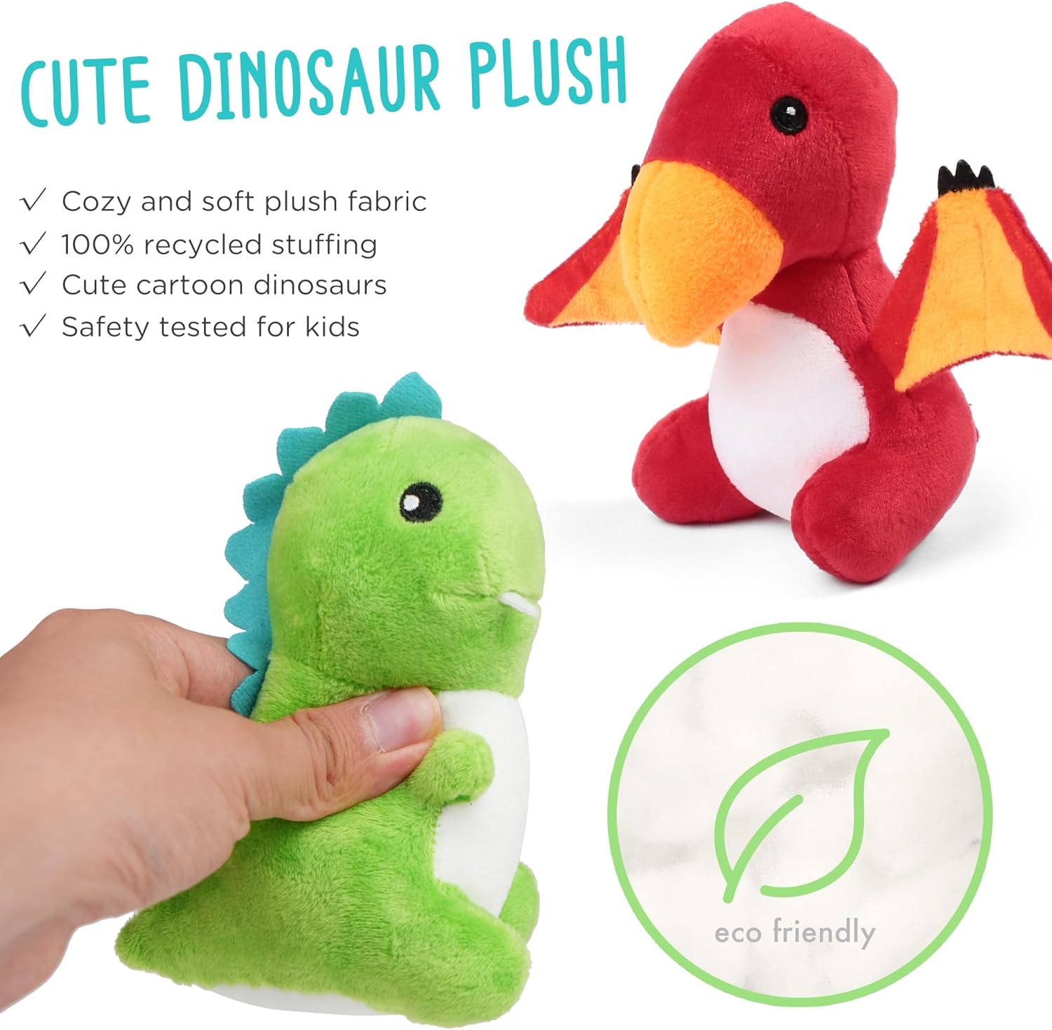 • 5 DIFFERENT DINOSAURS:A pack of 5 dinosaur plush toys; each measure 5 to 6 inches long; Includes a large dinosaur egg carrying case; Includes a Tyrannosaurus Rex (), Triceratops, Brachiosaurus (long neck), Stegosaurs, Pterodactyl